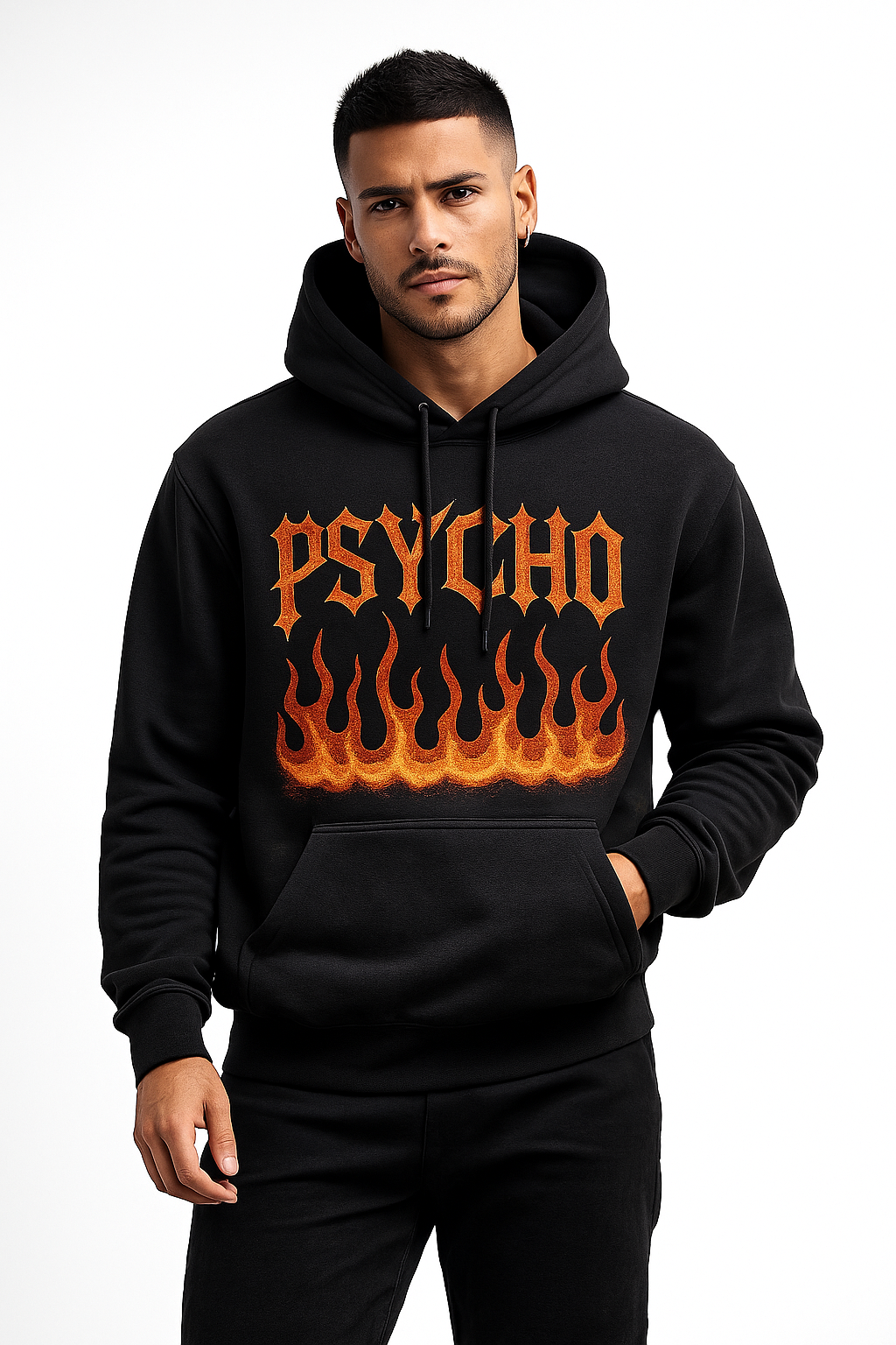Unleash pure GenZ energy with the Psycho Flame Black Hoodie — a bold streetwear essential designed for those who love standing out. The striking fiery graphic paired with the gothic-style lettering creates an aesthetic, powerful vibe that instantly elevates your fit.